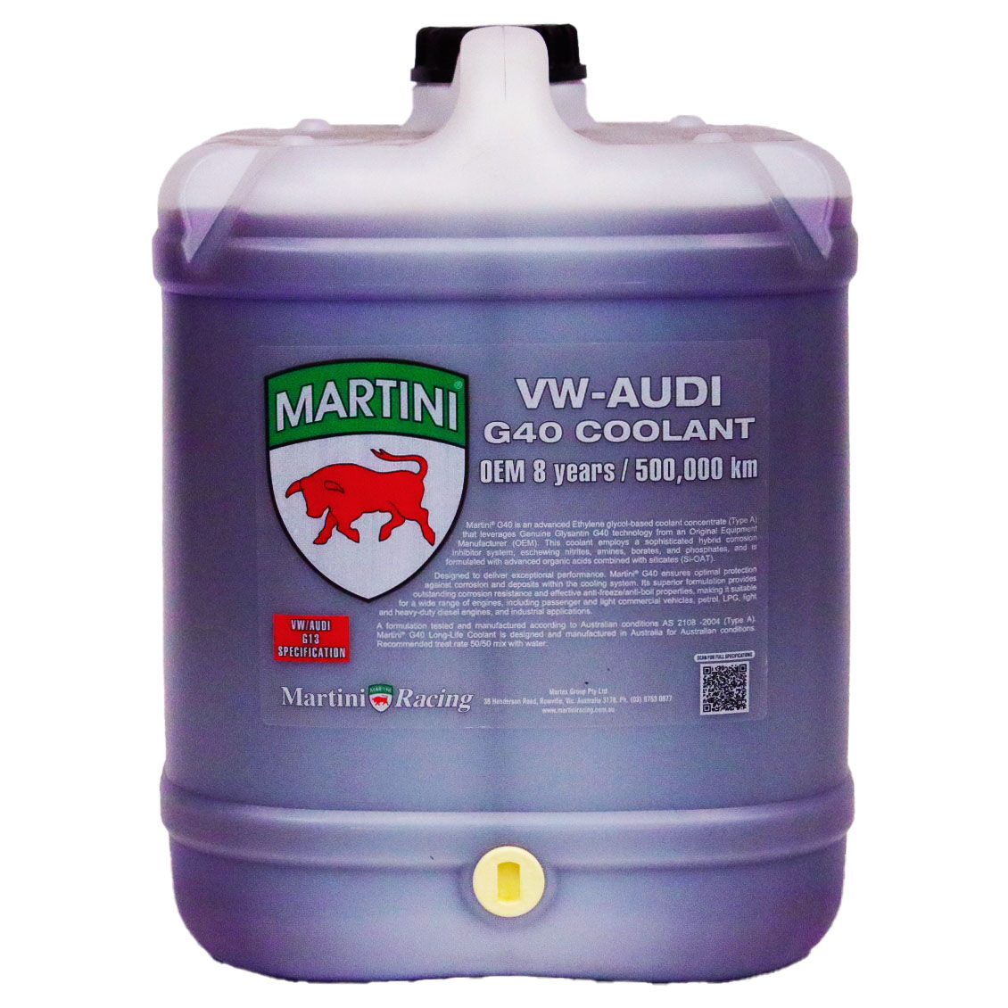 Tested and manufactured to meet the stringent Australian standard AS 2108 -2004 (Type A), Martini VW-Audi G40 Purple Coolant is designed to excel in Australia’s demanding climate. It boasts a long service life of up to 8 years or 500,000 kilometers, ensuring optimal engine protection over time. The recommended treat rate is a 50/50 mix with water for the best performance.